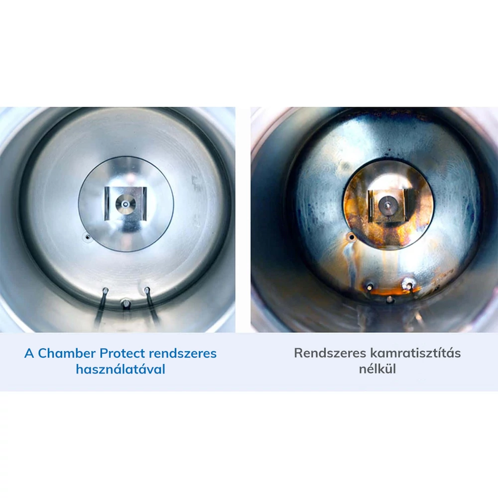 Megbízható tisztítás és hosszú távú védelem, amely ragyogóan tartja autoklávját: A Chamber Protect segítségével még a szemmel láthatatlan szennyeződéseket is eltávolíthatja, így megelőzheti a makacs elszíneződéseket és lerakódásokat a kamrában és a tálcákon.